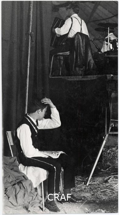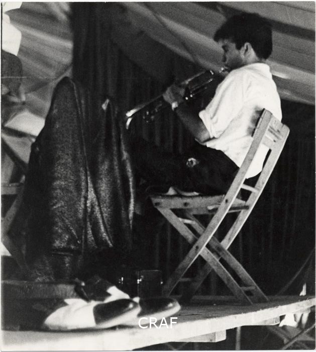 Circo. Interno. Primo piano di scarpe. Ritratto dfi profilo di suonatore di...