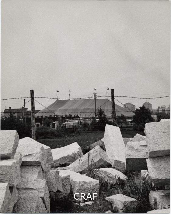 Pietrame in primo piano, tendone da circo, recinzione in filo spinato e prato