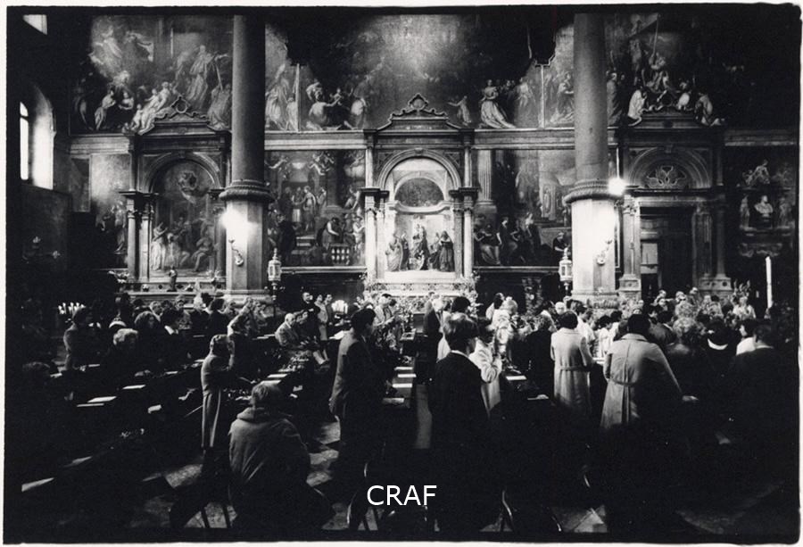 chiesa, interno, pilastri, affreschi, persone, prete, cerimonia