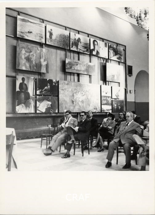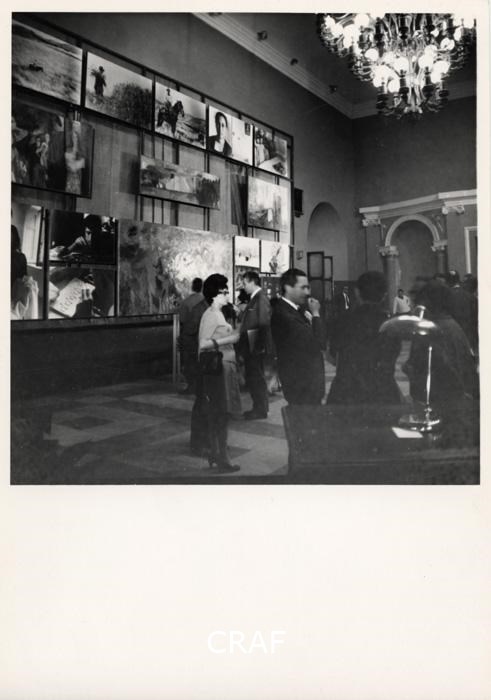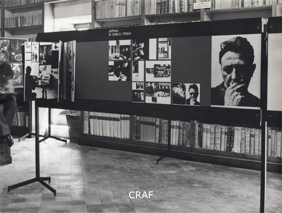 sala, esposizione, pannelli, fotografie, scaffali, libri