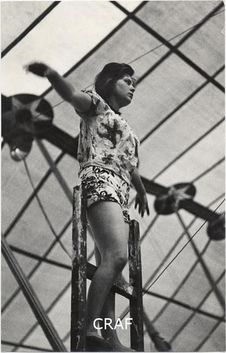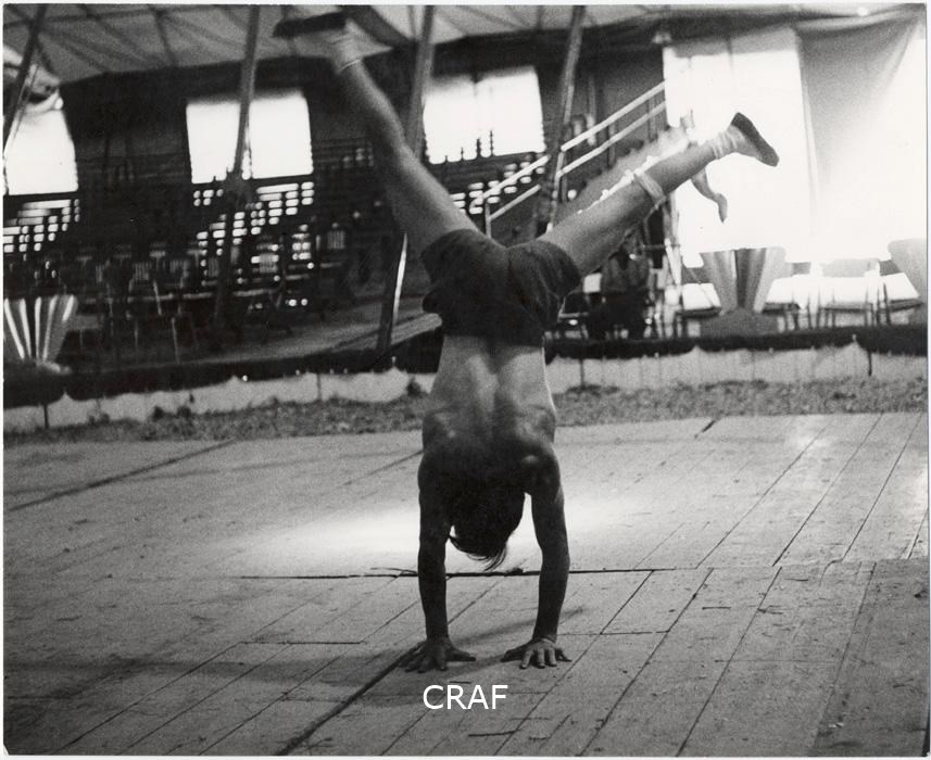 Circo. Interno. Ritratto a figura intera di ragazza acrobata con le braccia...
