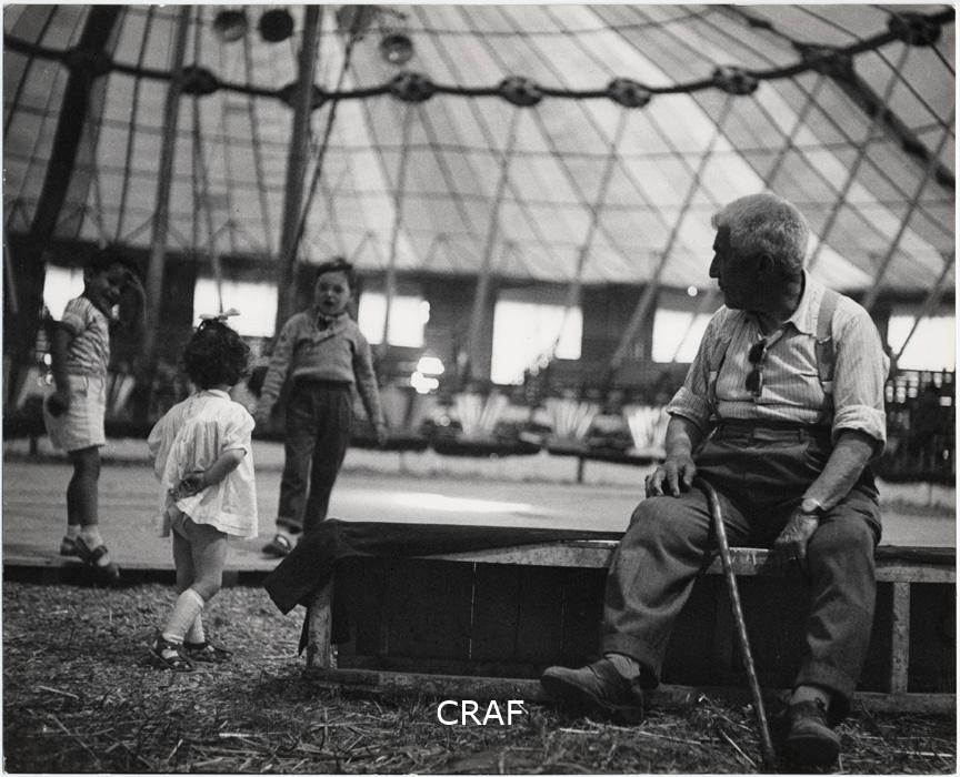 Circo. Interno. Primo piano di uomo anziano seduto con bastone in mano...