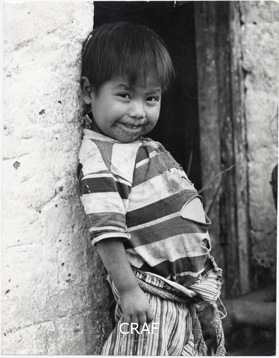 Perù. Ritratto di bambino sorridente con abiti rigati e appoggiato ad un muro