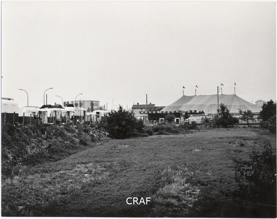 Tendone di circo e roulottes accanto ad un prato recintato