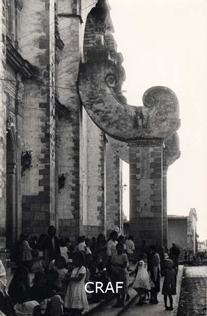 ruderi, architettura, navate, pilastri, archi, campanile, frontone