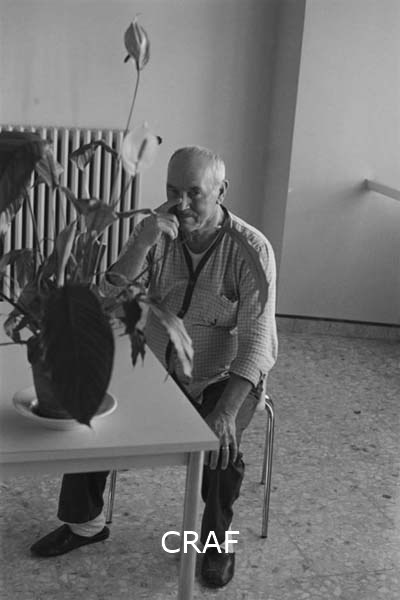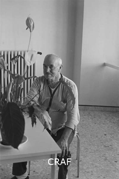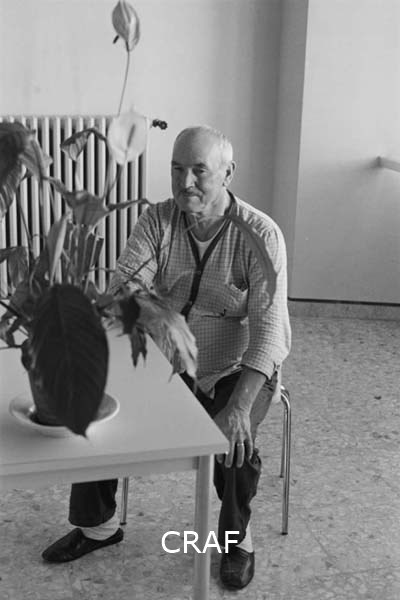 Un uomo anziano seduto, un vaso di fiori sopra un tavolo e un termosifone dietro