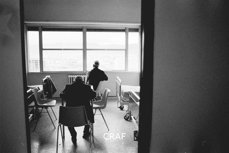 Due anziani seduti di spalle in una stanza dell'ospedale di Avezzano