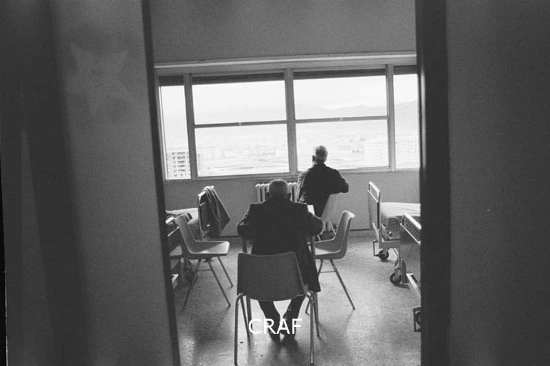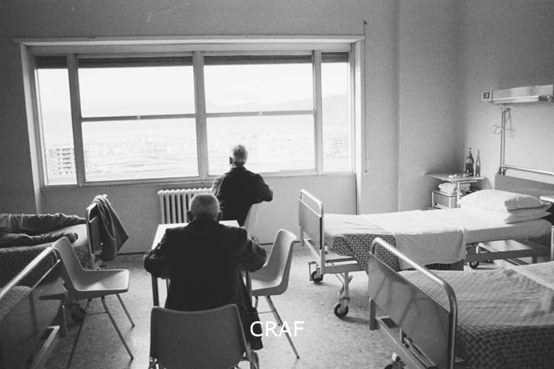 Due anziani seduti di spalle in una stanza dell'ospedale di Avezzano. A destra...