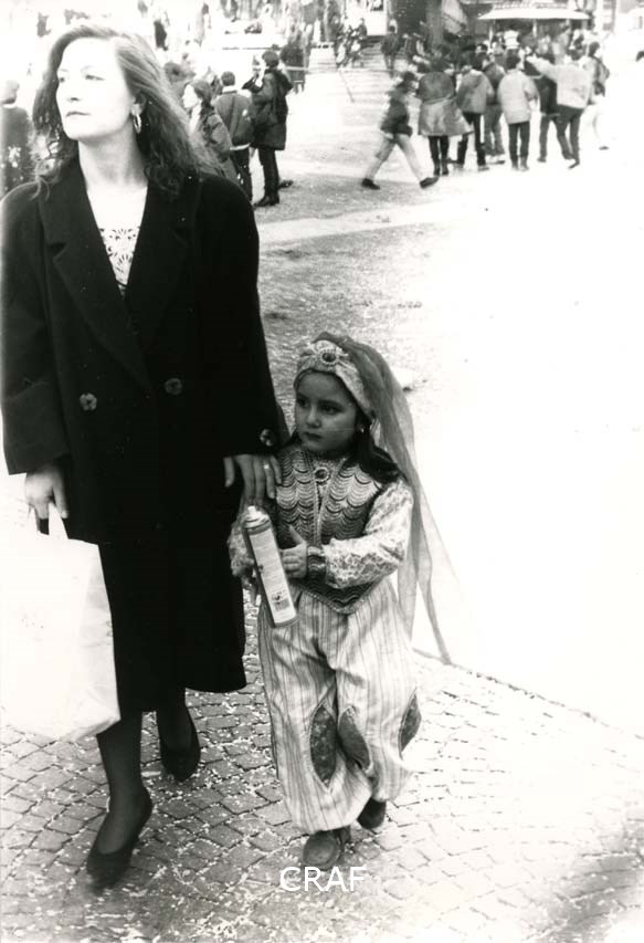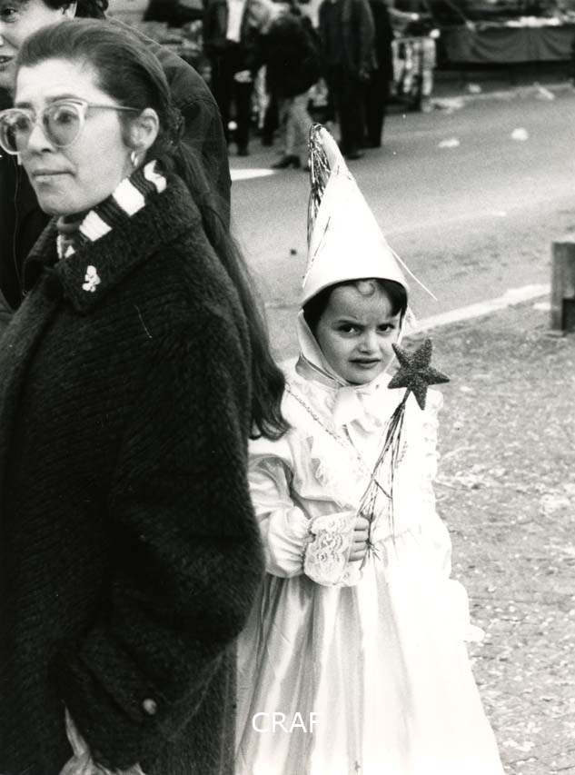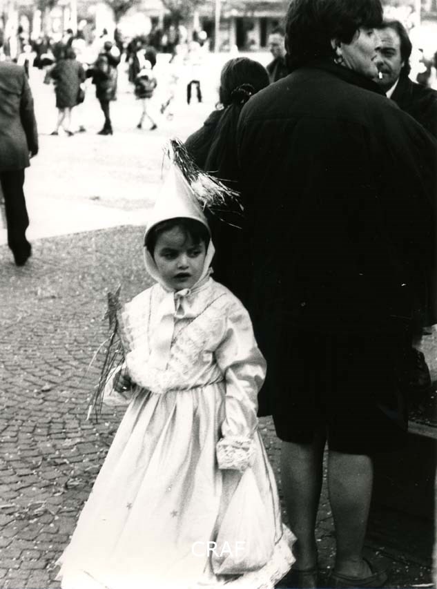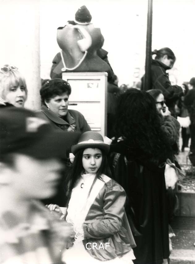 Al centro destra della fotografia una fanciulla con un costume di carnevale da...