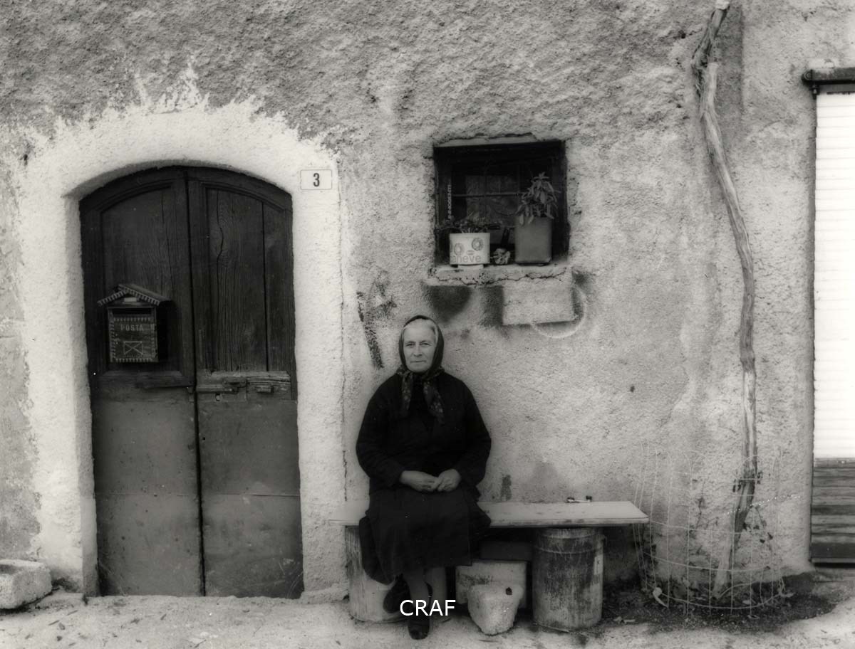 Al centro della fotografia una donna anziana con foulard in testa seduta su di...