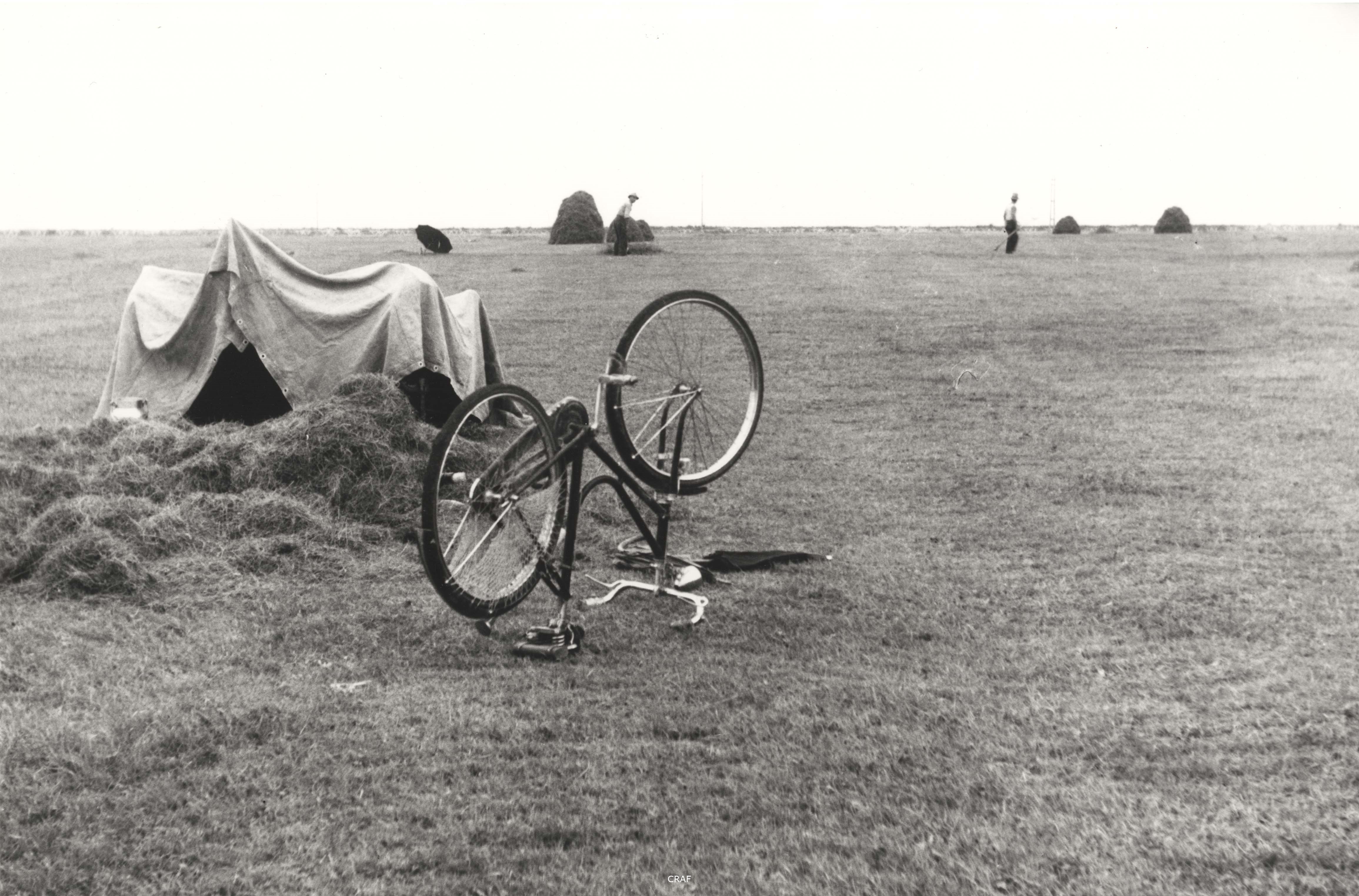 Al centro sinistra della fotografia una bicicletta rovesciata e due ombrelli...