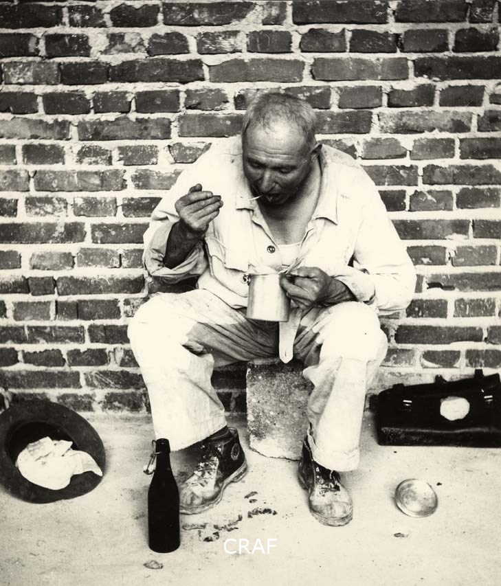 Al centro dell'immagine un uomo durante la pausa pranzo mentre mangia dalla sua...