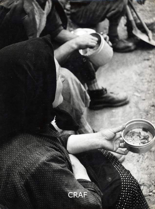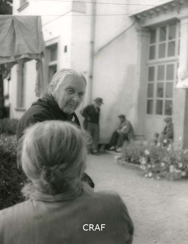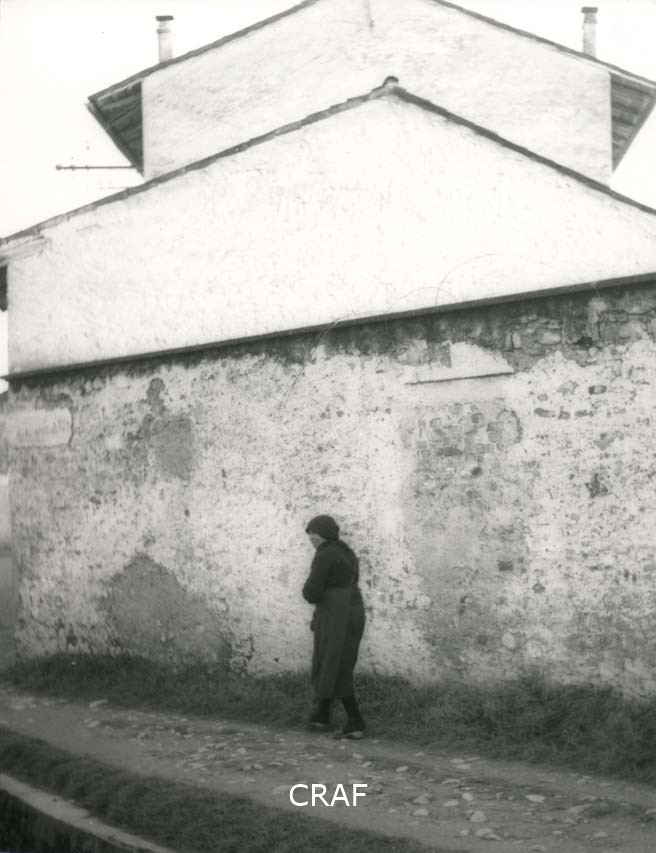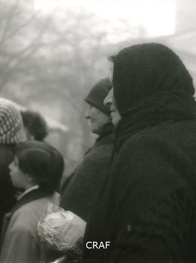 Alla destra della fotografia una donna anziana di profili con il capo coperto...