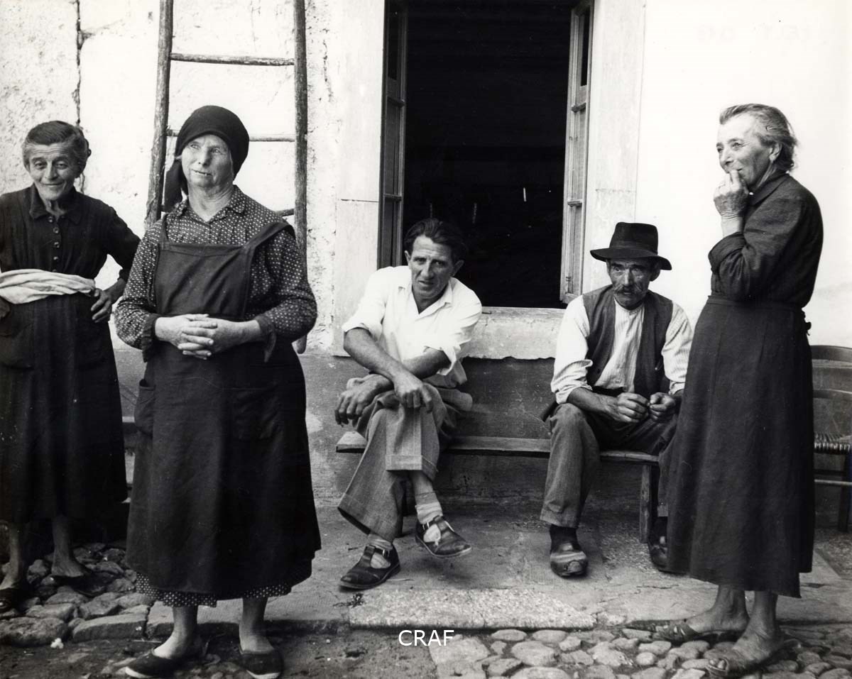 Tre donne anziane in piedi e due uomini seduti: alla destra della fotografia...