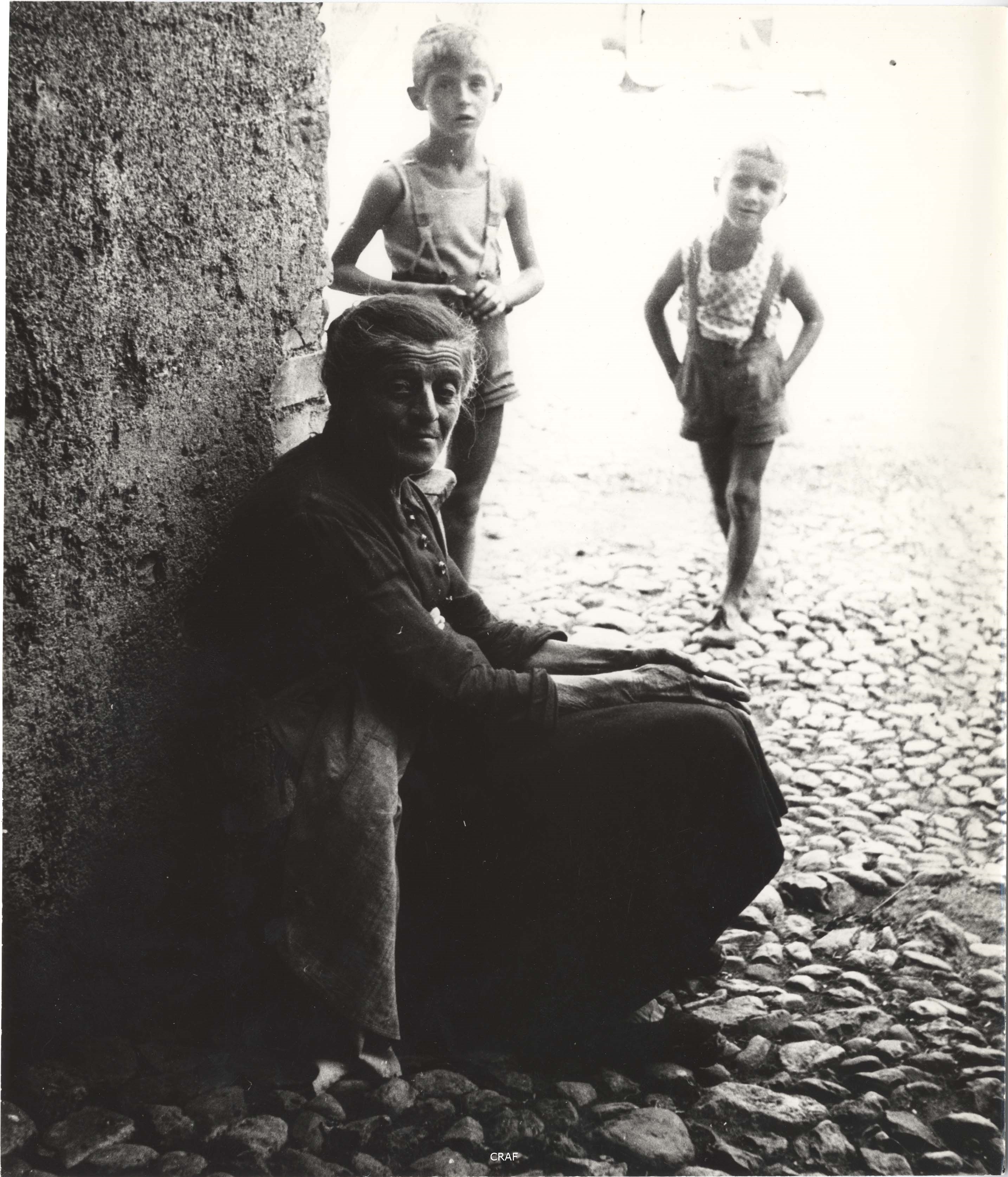 Al centro della fotografia un donna anziana accovacciata e appoggiata al muro...