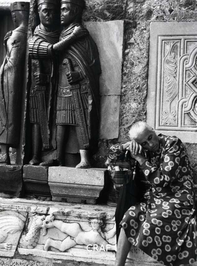 Alla destra della fotografia una fanciulla seduta sulla scalinata di pietre;...