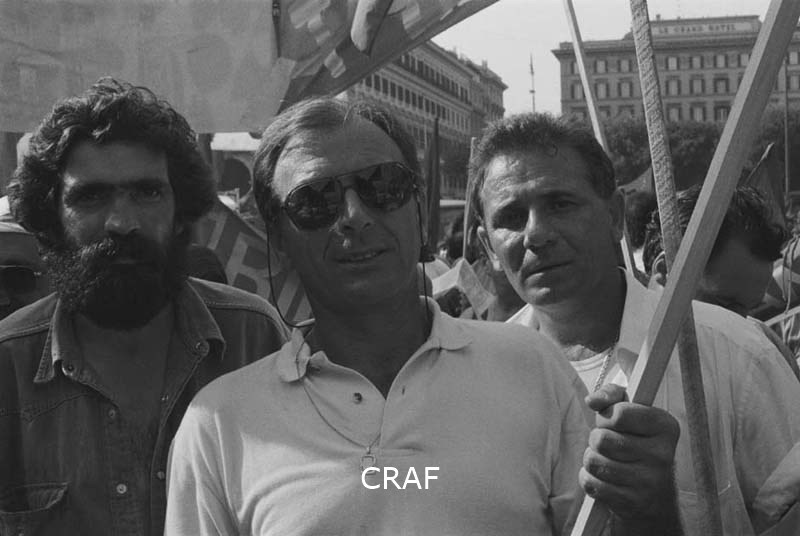 Manifestazione di Rifondazione Comunista a Roma; ritratto di tre uomini: alla...
