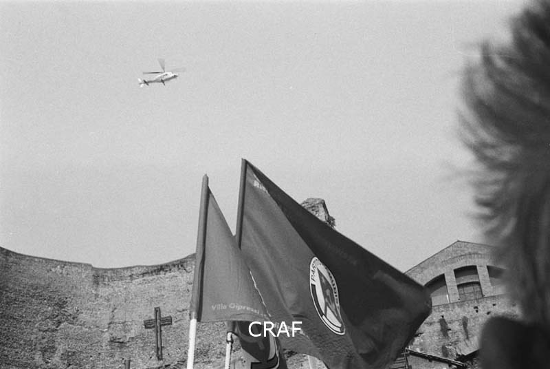 Manifestazione di Rifondazione Comunista a Roma; veduta del cielo; due aste...