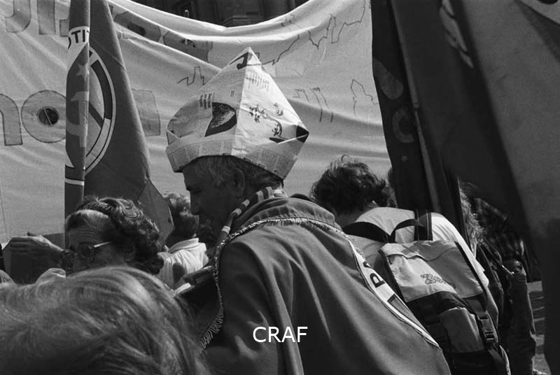 Manifestazione di Rifondazione Comunista a Roma; un uomo con berretto di carta...