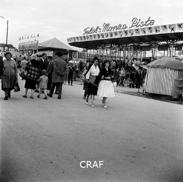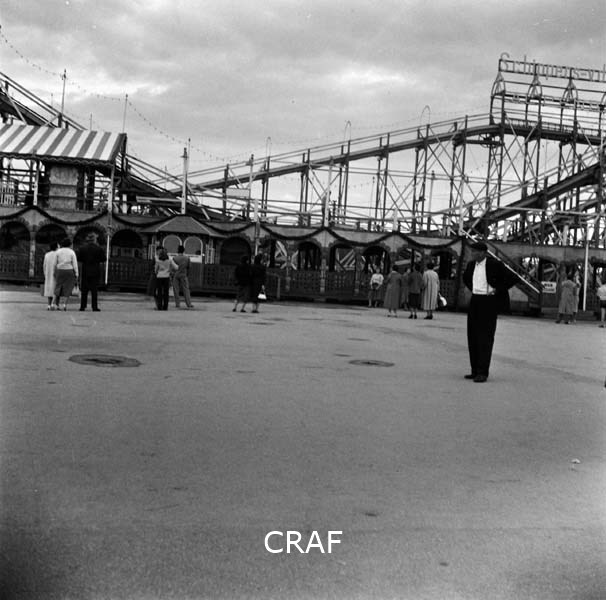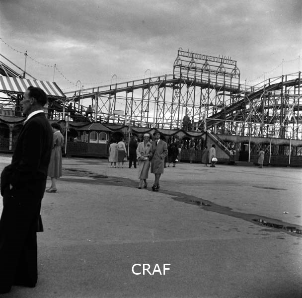 Passanti accanto ad una giostra (montagne russe) del luna park
