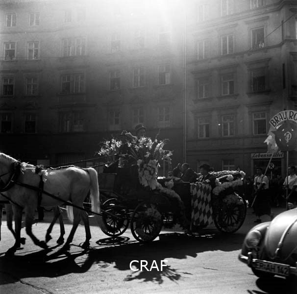 Calesse, decorato con fiori, e cavalli mentre percorrono una via di Monaco