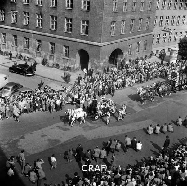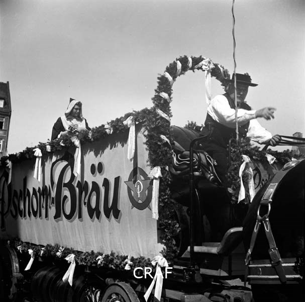 Conducente di un calesse decorato con fiori che pubblicizza la birra Pschorr;...