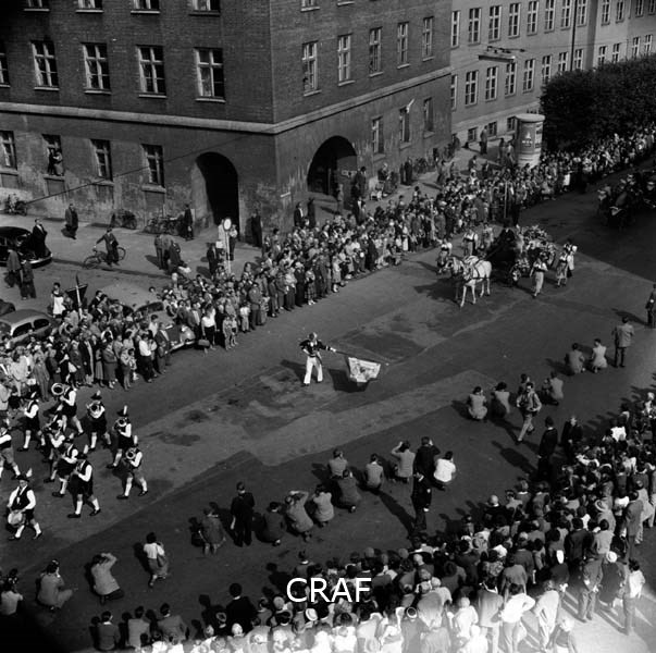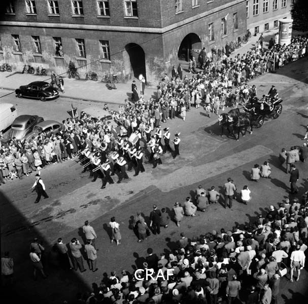 Veduta dall'alto di una banda musicale e calesse con due cavalli mentre...