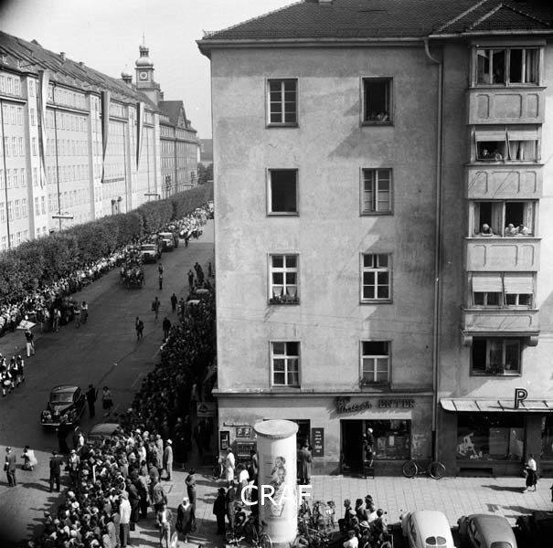 Veduta di un palazzo e di una via affollata di persone a Monaco visto dall'alto...