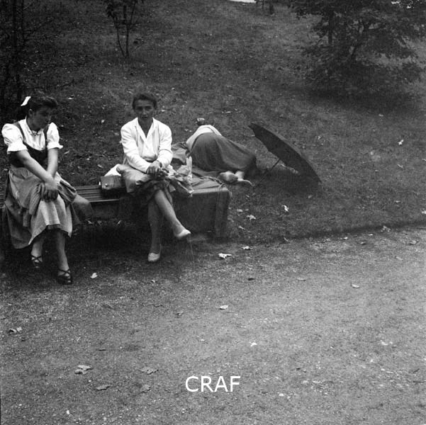 Due donne sedute su di una panca in un parco, un'altra donna distesa nel prato...