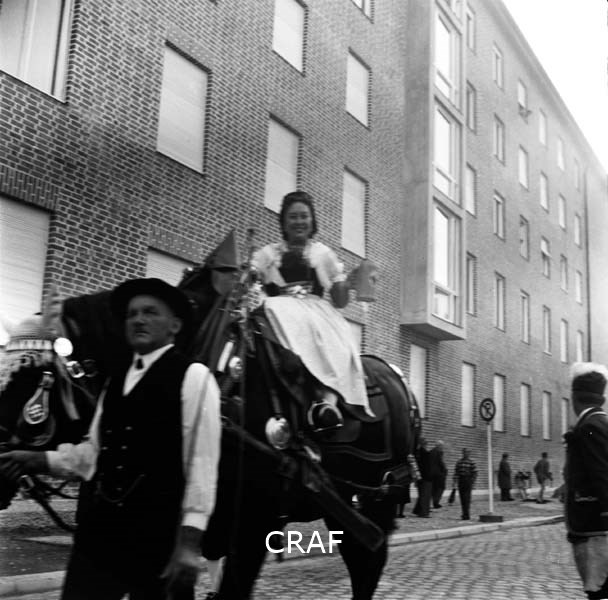 Donna con abiti in stile bavarese sopra un cavallo accompagnato da un uomo in...