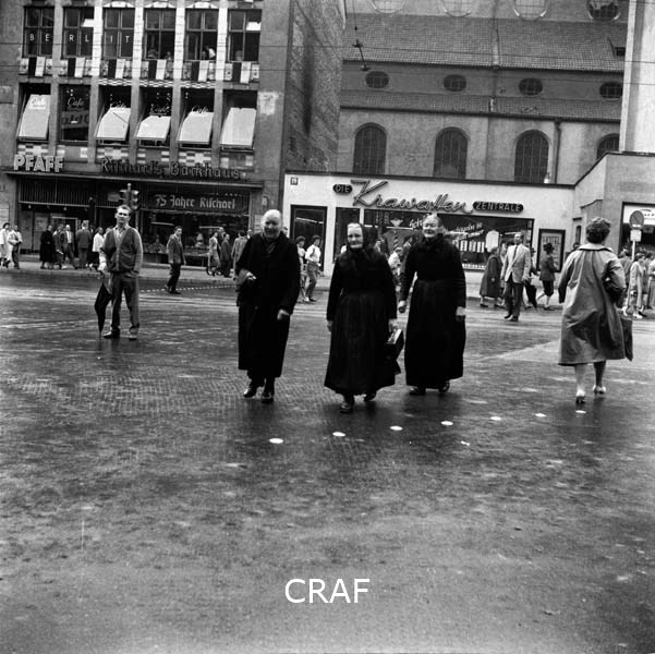 Tre donne anziane mentre camminano in una piazza di Monaco