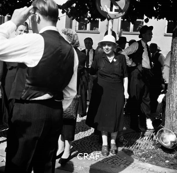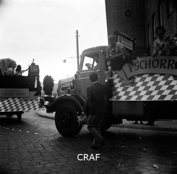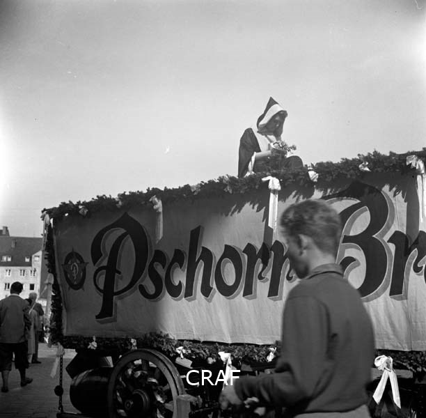 Passaggio di camion che sponsorizzano la birra Pschorr; una donna dal camion...