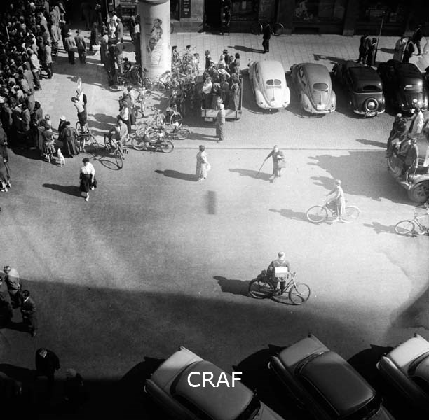 Passanti (in bicicletta e a piedi) visti dall'alto di un palazzo, in una via di...