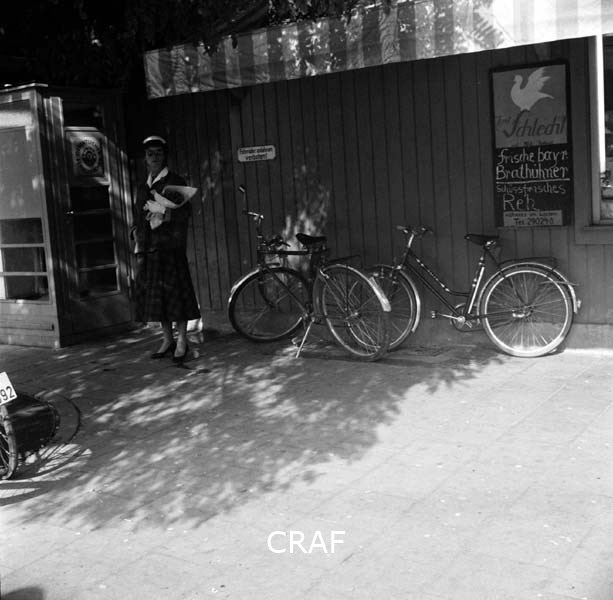 Donna in piedi accanto ad un negozio e a due biciclette posteggiate