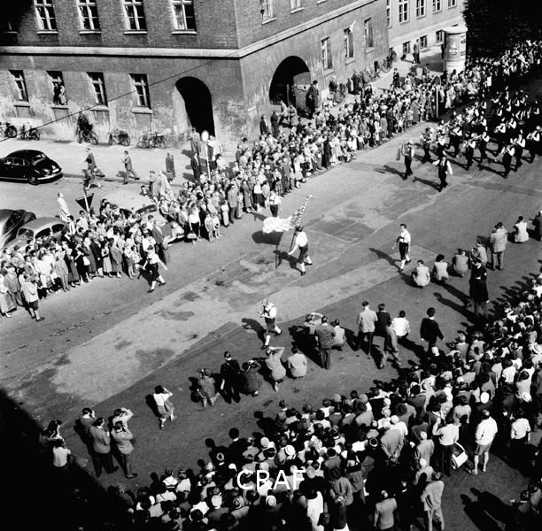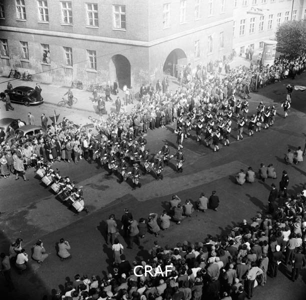 Sfilata di una banda musicale attraverso una via di Monaco, vista dall'alto di...