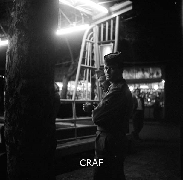 Due uomini in divisa militare tra le giostre di un luna park