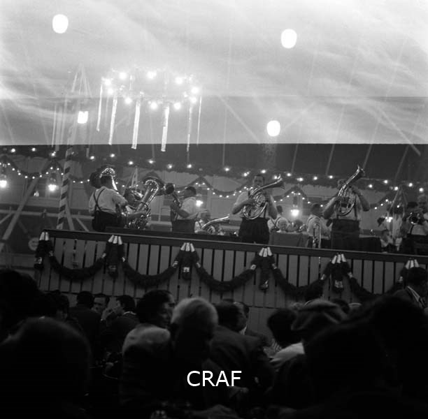 Gruppo di suonatori sopra un palco e all'interno di un locale pubblico