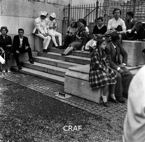 Gruppo di persone sedute sulla scalinata di un palazzo di Monaco