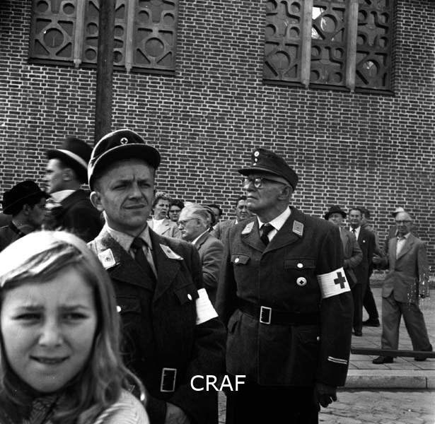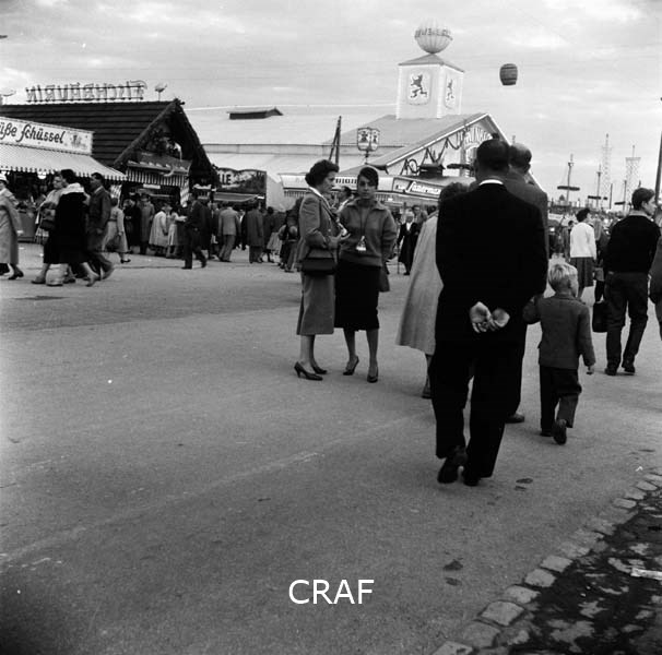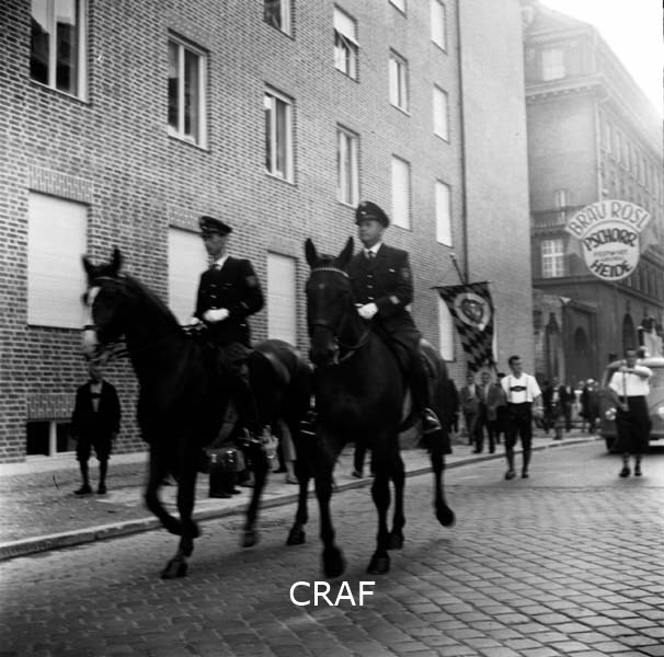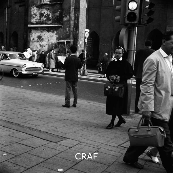 Passanti per le vie di Monaco; al centro dell'immagine due uomini della croce...