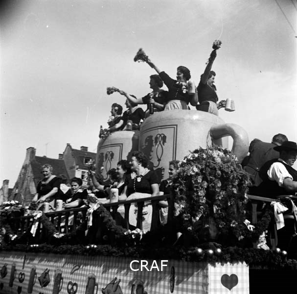 Carro addobbato con fiori e finti boccali di birra di grandi dimensioni e donne...