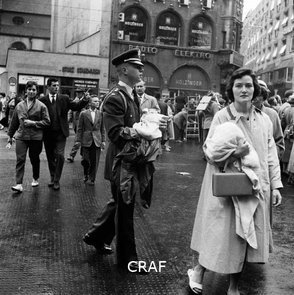 Passanti per le vie di Monaco; al centro dell'immagine un uomo in divisa tiene...