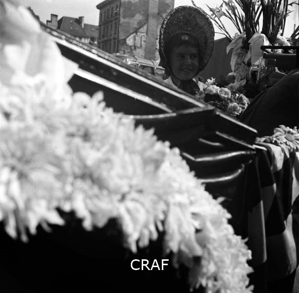Viso di una donna (con cappello) in un carro decorato con fiori
