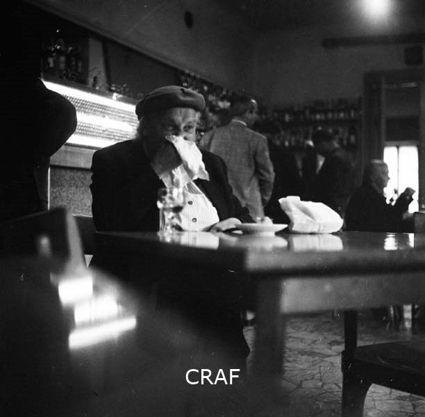 Interno di un locale pubblico; al centro dell'immagine una donna anziana seduta...