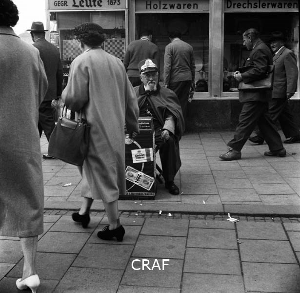 Passanti per le vie di Monaco; al centro dell'immagine un uomo seduto, con...