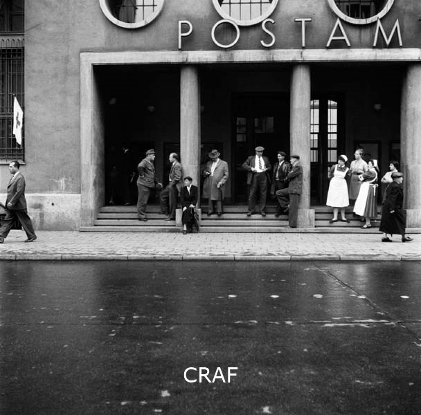 Gruppo di uomini e donne situati sotto il portico dell'ufficio postale; sul...