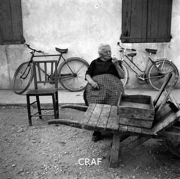 Al centro dell'immagine una donna anziana seduta su una sedia mentre fuma la...