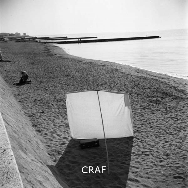 Veduta della spiaggia di Caorle con una tenda per coprirsi dal sole