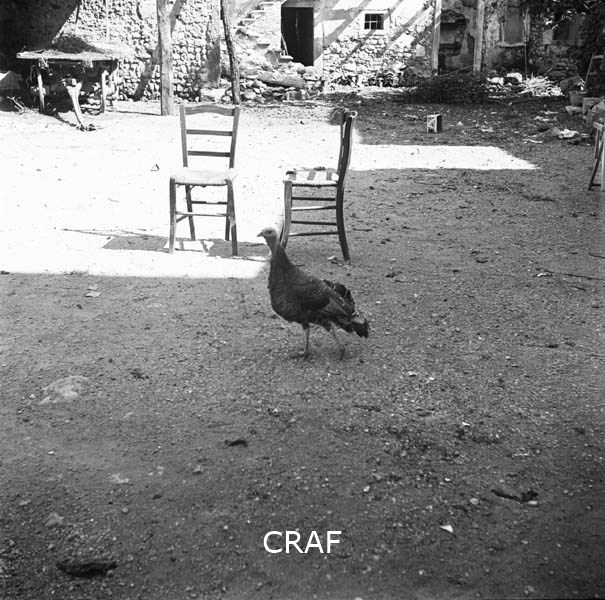 Nel cortile di un'abitazione, un tacchino, due sedie e sullo sfondo un carro