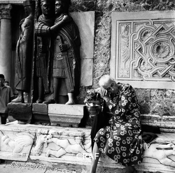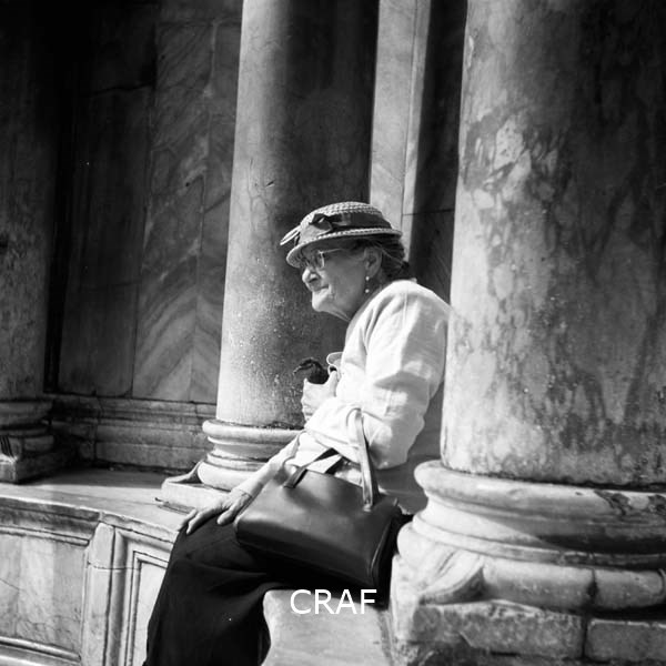 Donna anziana, con cappello in testa, seduta tra un colonnato e tra le mani...