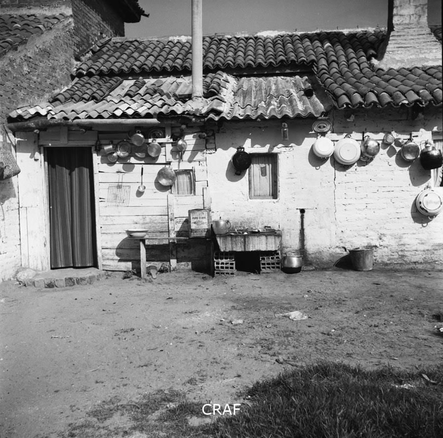 Veduta di una casa contadina dove, al muro, sono appese pentole di vario tipo e...